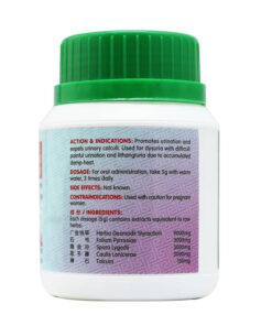 Promotes urination and expels urinary calculi. Used for dysuria with difficult painful urination and lithangiuria due to accumulated damp-heat.